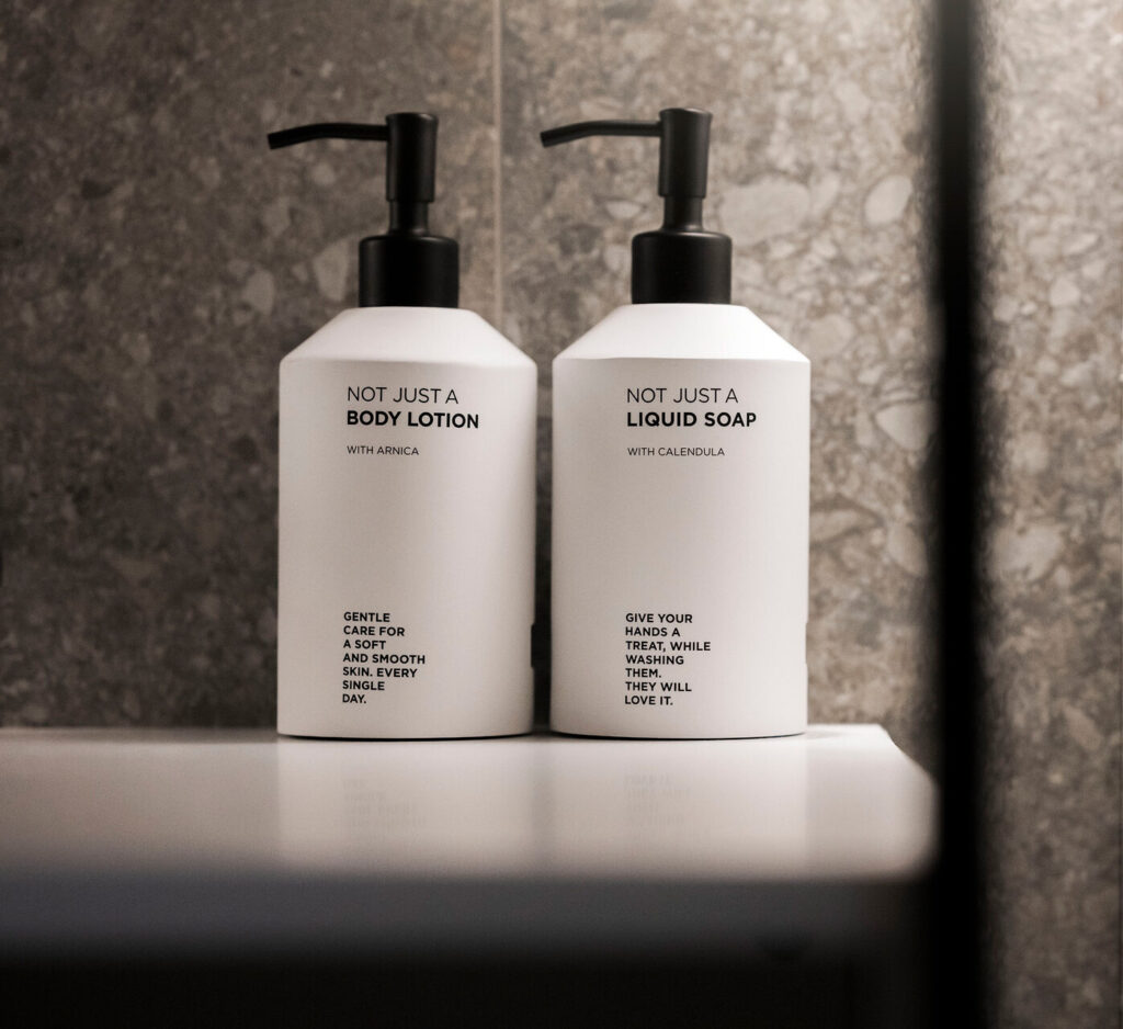 Die idyllische Natur Südtirols im Einklang mit mediterranen Wirkstoffen aus belebender Zitrone, erfrischender Pfefferminze, stärkendem Weizenkleie-Extrakt und wohltuendem Lavendel: Die „Authentics“ Kosmetiklinie verwöhnt nicht nur Haut und Haar, sondern dank ihres delikaten Aromas auch Seele und Geist. Die getönten, recycelbaren Flaschen im Retro-Look erinnern an die dunklen Glasbehälter, die einst von Apothekern verwendet wurden und schützen die Inhaltsstoffe vor UV-Strahlen. Die stilvoll schlichten Flaschen sind ein wunderbares Accessoire für jeden Hotelbereich, vom Zimmer bis zum Spa.